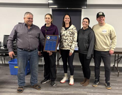 Mayor Andy Lennox congratulates Team Coburn Insurance on winning the Late Draw and Overall Bonspiel. Pictured, from left: Mayor Lennox, Christy Tangney, Angie Hunt, Lyndsey Wilson and Andrew Coburn.